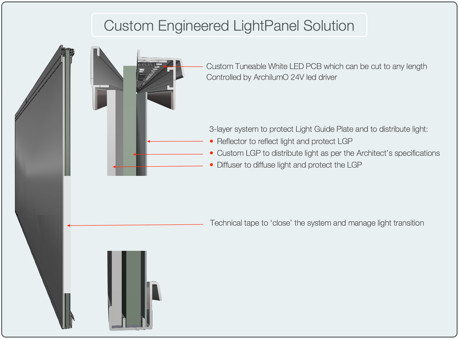 - Custom project engineered 24V Tuneable White LED PCB that can be trimmed to any custom length to fit the many different panel sizes