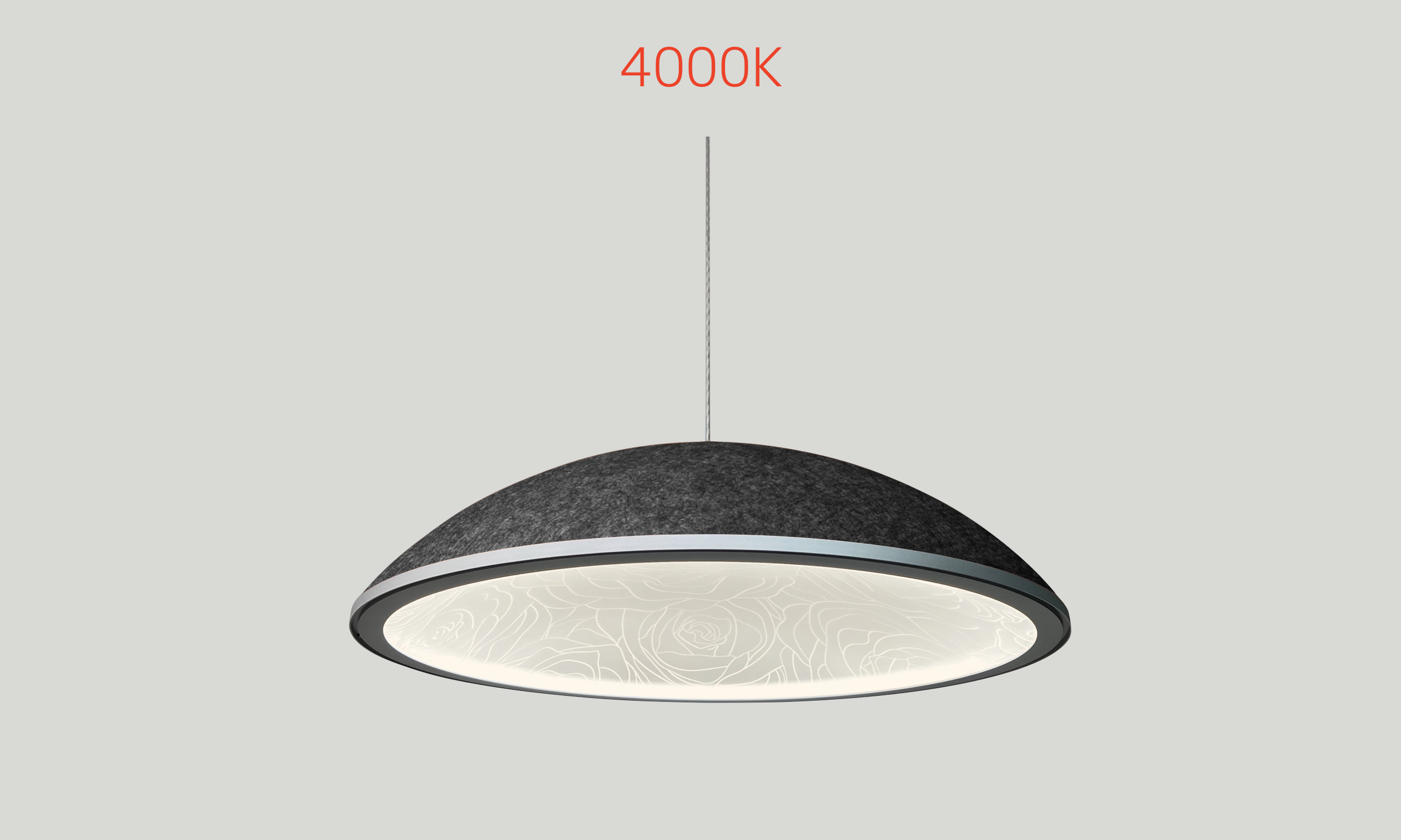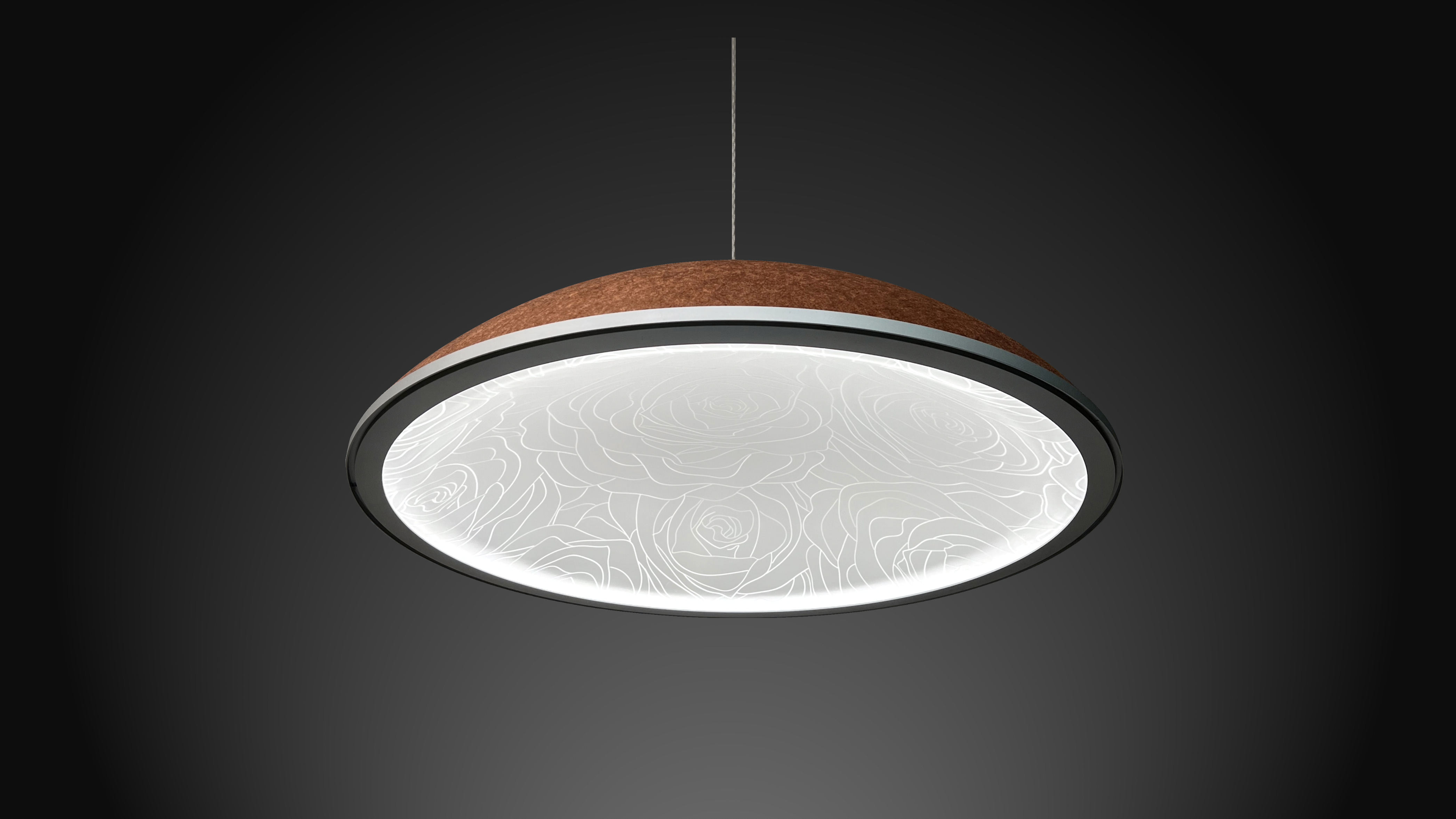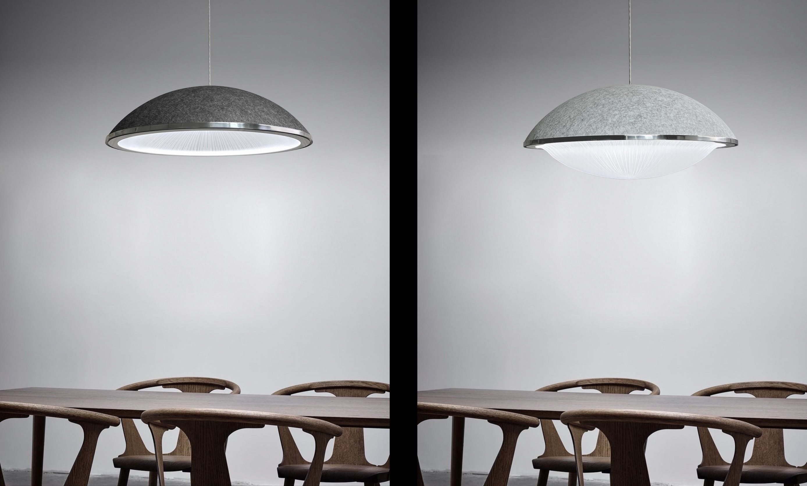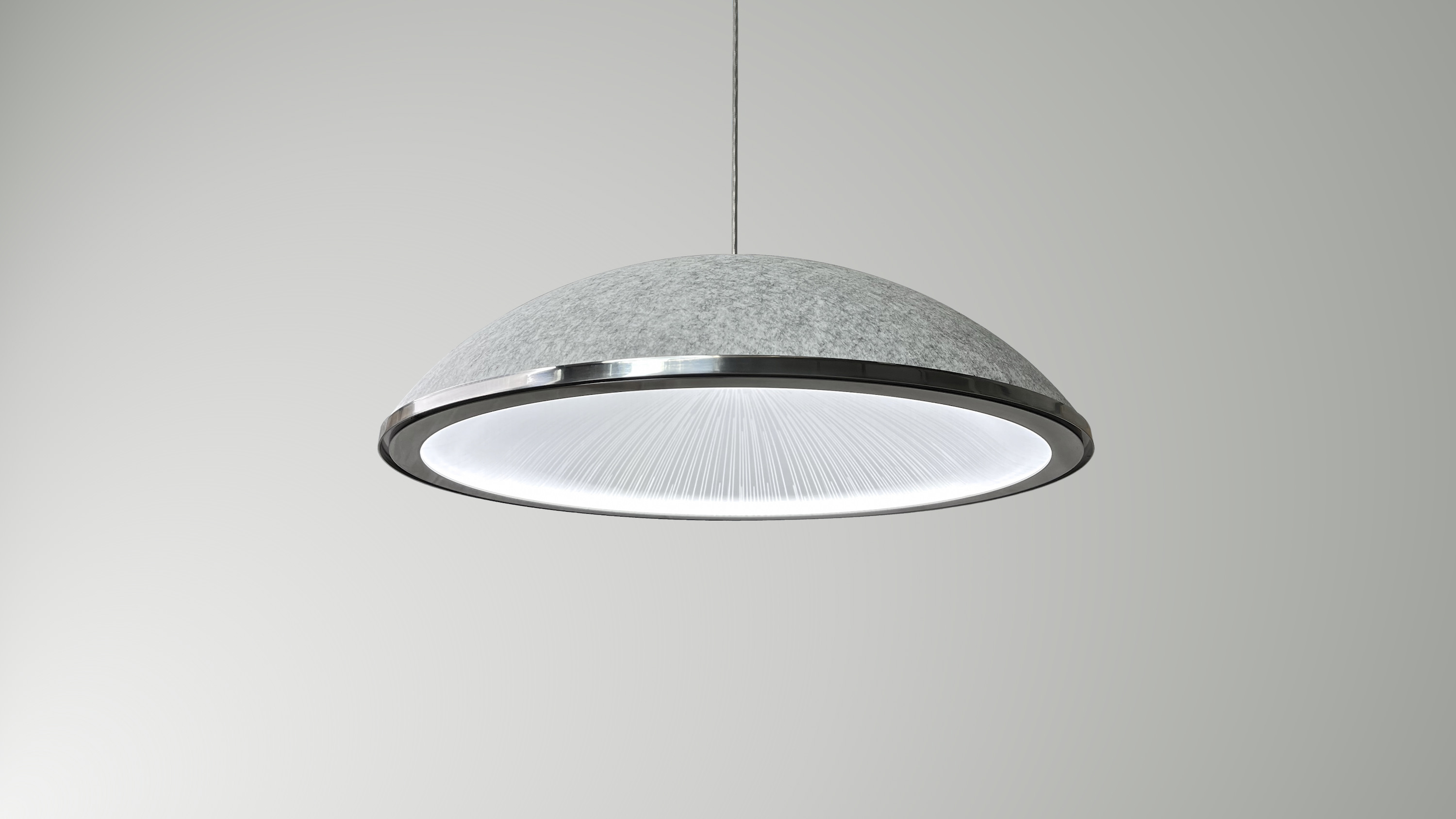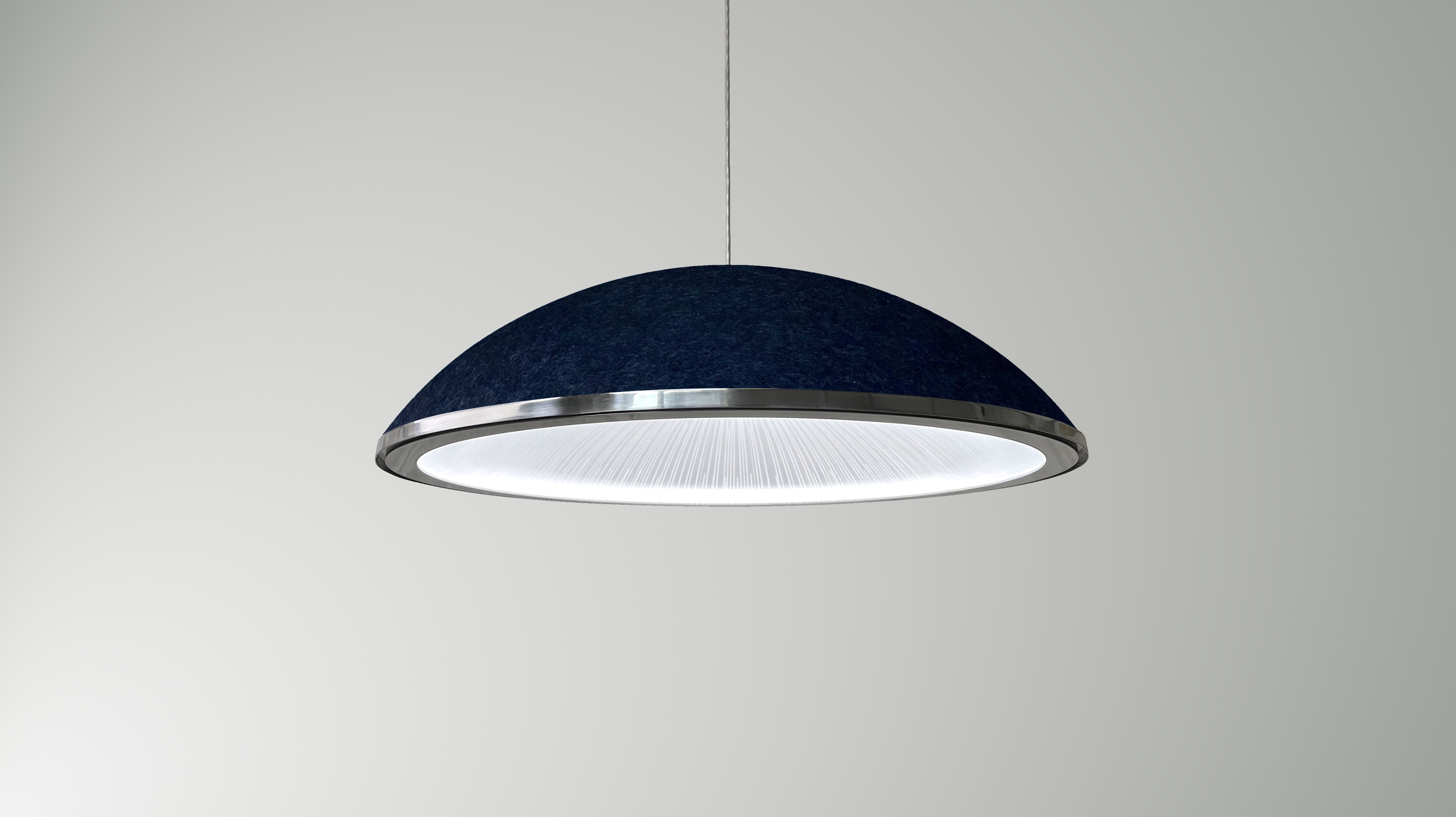 A beautifully designed acoustic high performance lighting fixture that can be customised in Dimension (from 550mm -1150mm diameter), Ring Finish, Felt Dome Colour, Light Guide Etch Design and Control.