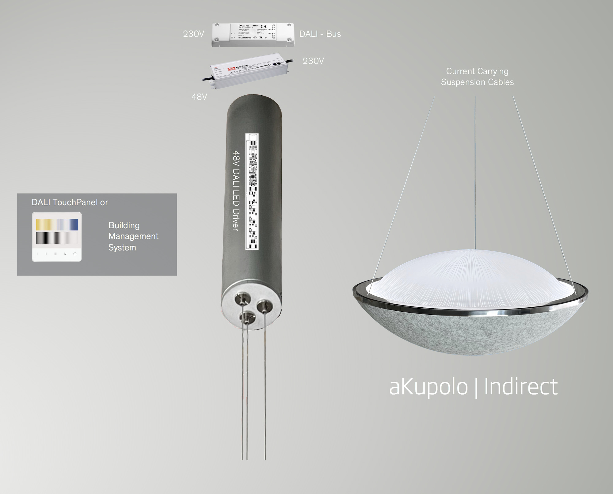aKupolo light fixtures are controlled by a proprietary DALI 2 LED Driver. Multiple standard control options are available including: