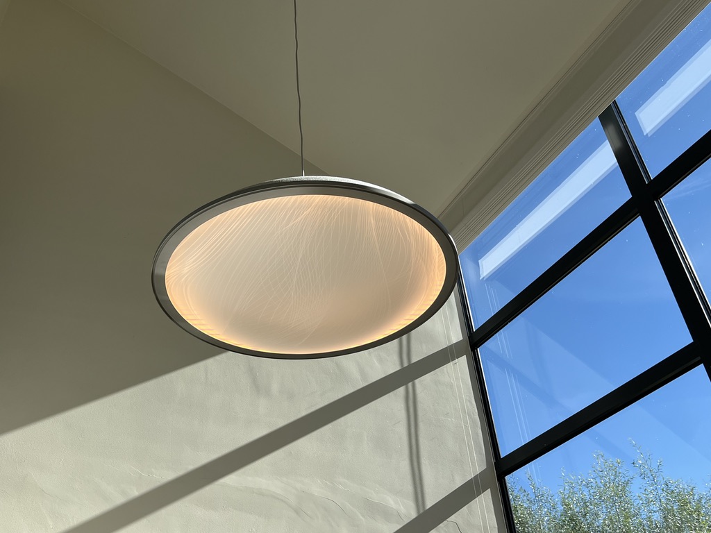 Here featured aKupolo | Convex, 950mm diameter, ‘Wave’ etch-design, ‘MarbleGrey’ acoustic felt, ‘AluMatt’ ring